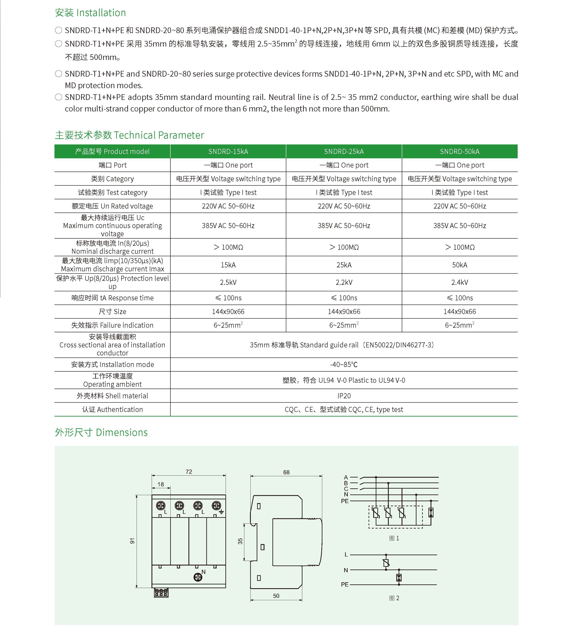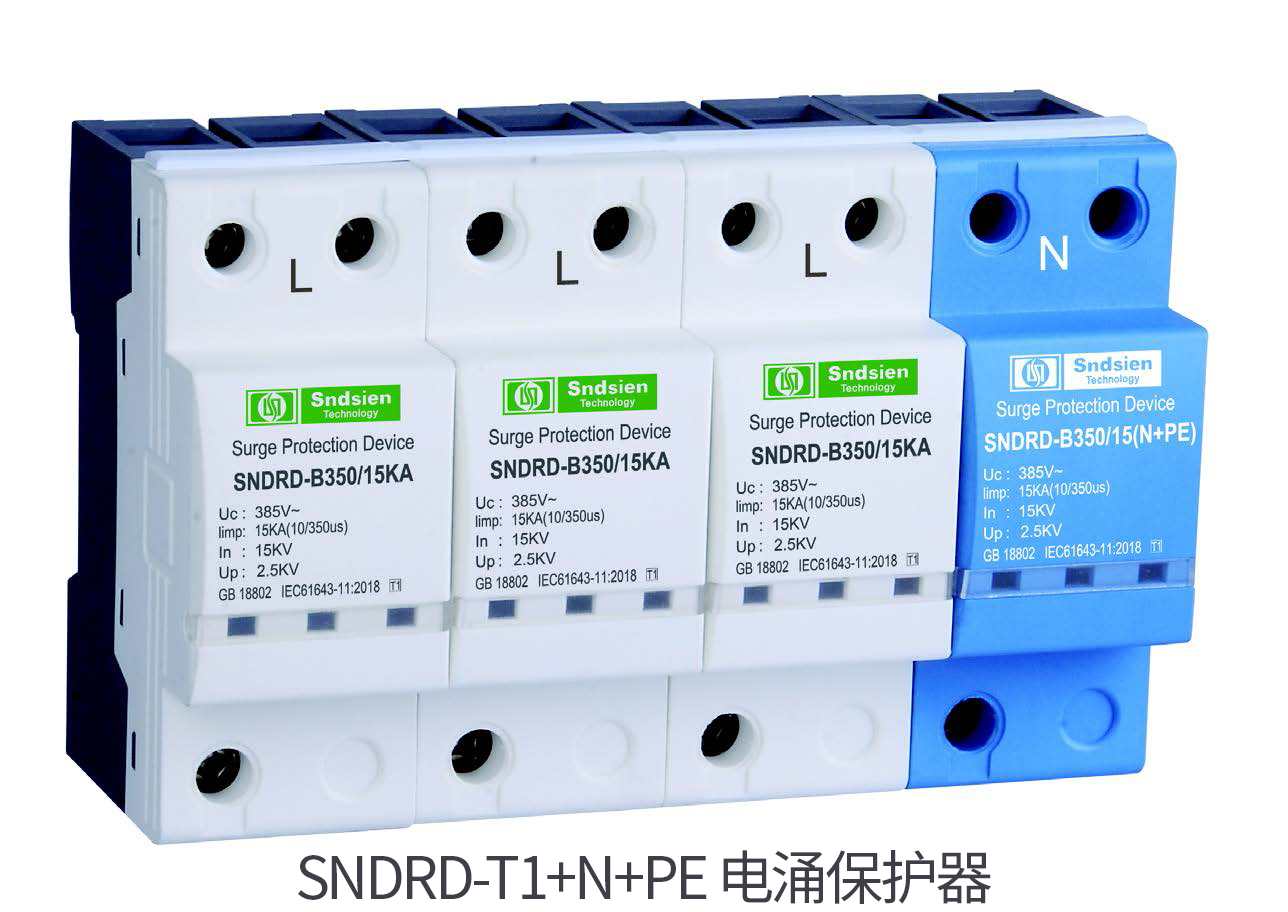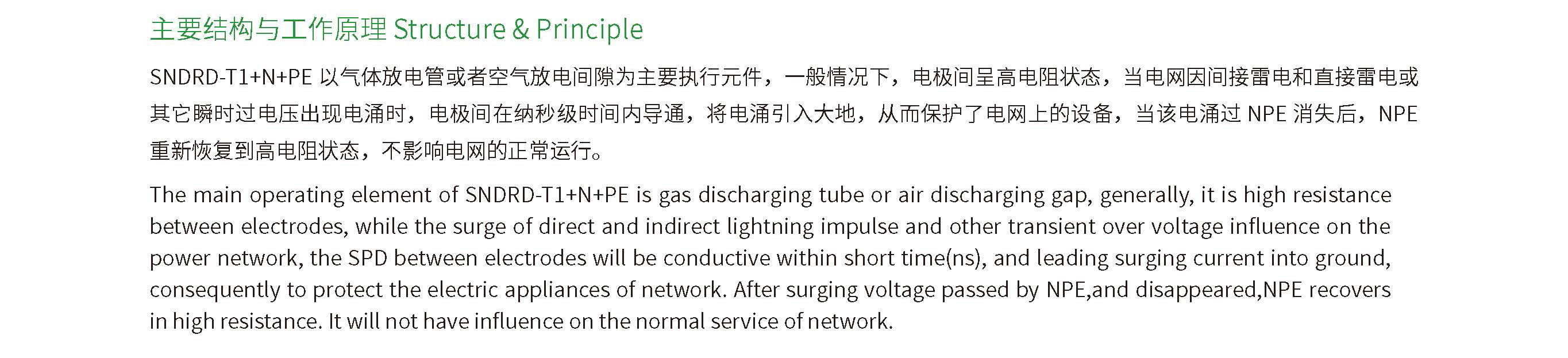 用于中线与PE 等电位系统之间,对间接雷电和直接雷电影响或其他瞬时过电压的电涌进行保护。并与SNDRD-20~80 系列电涌保护器组