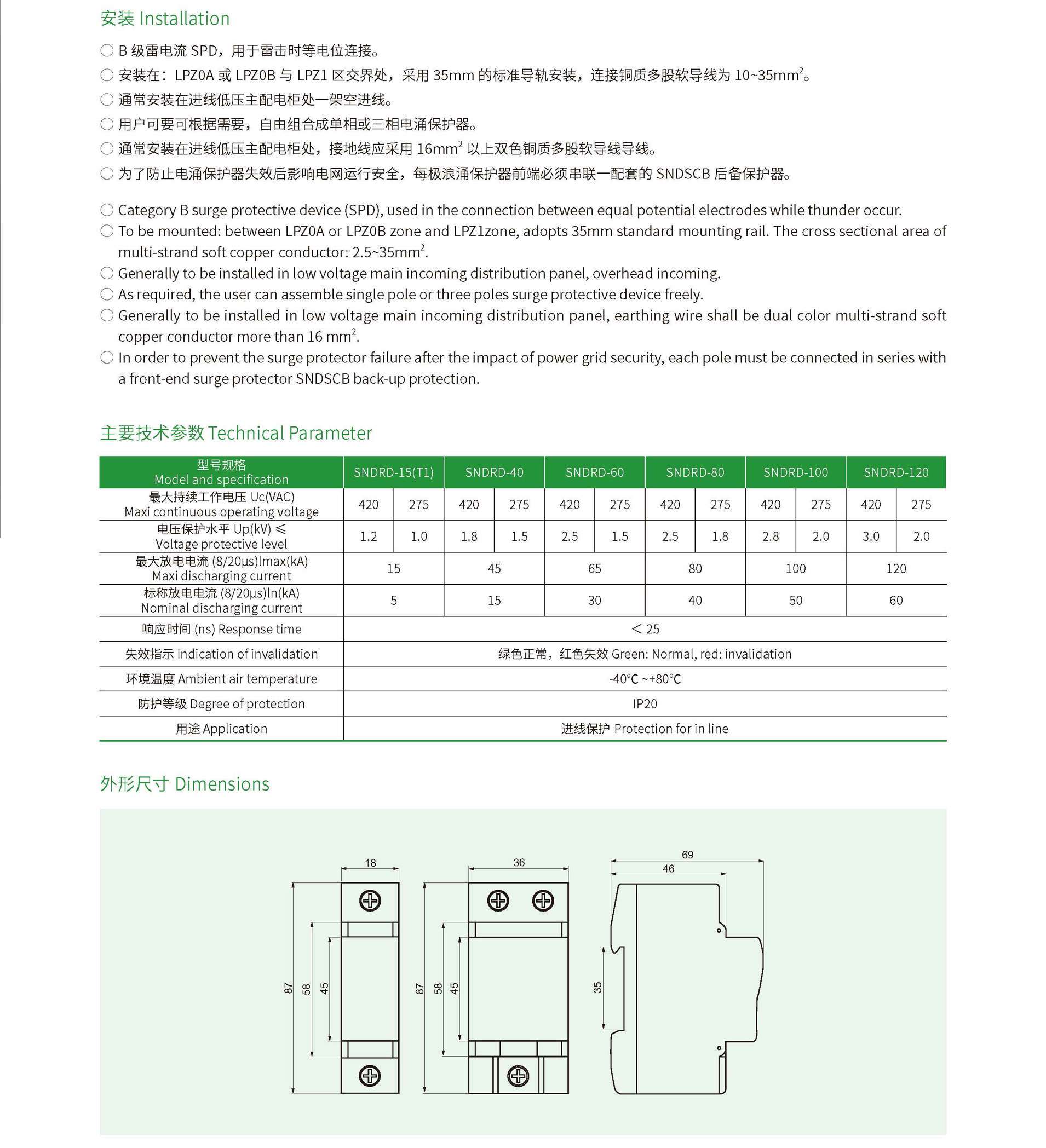 SNDRD 系列电涌保护器( 以下简称SPD) 适用于交流50/60Hz,额定电压380V 的IT、TT、TN-C、TN-S、TN-C-S. 等供电系统,对