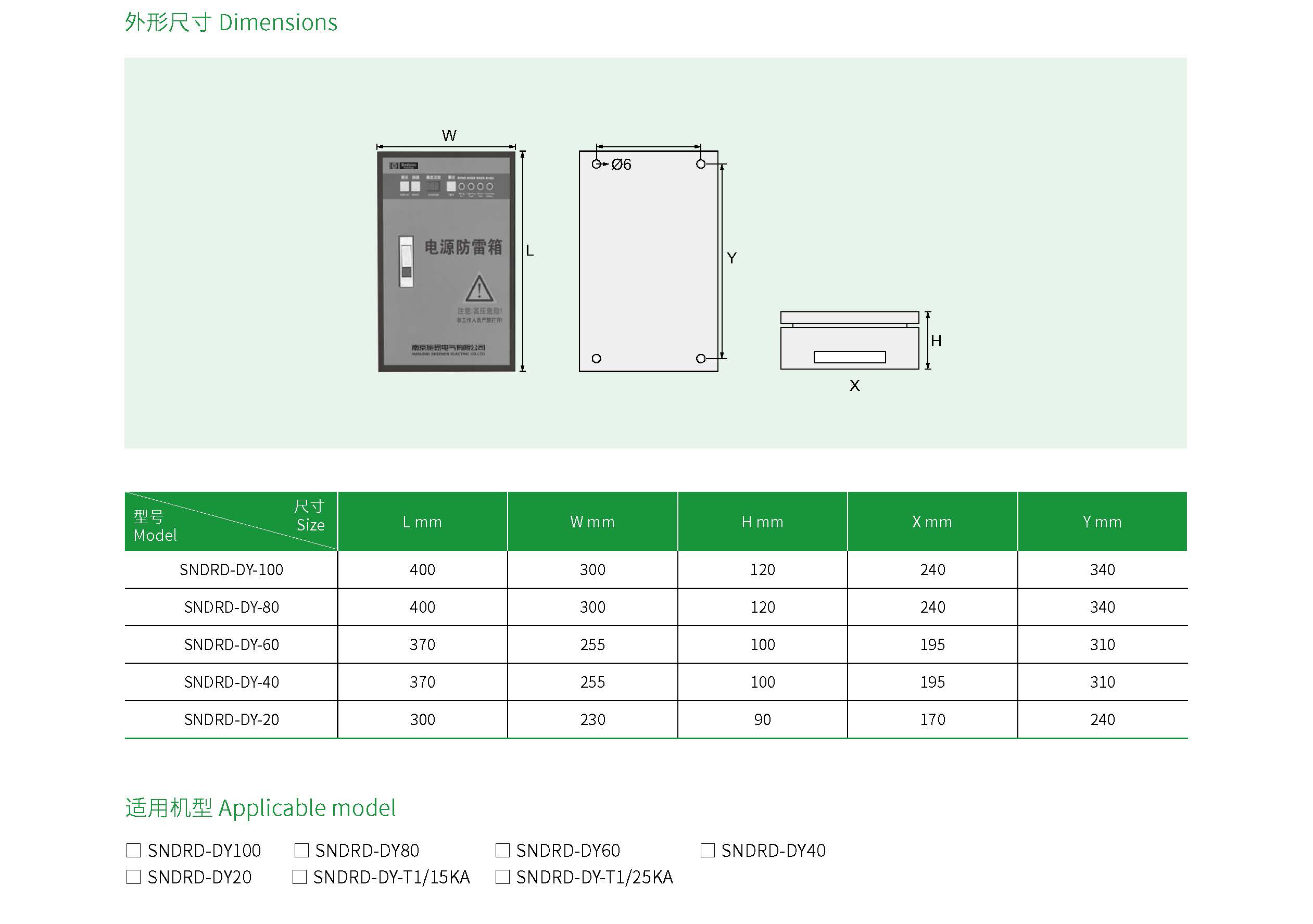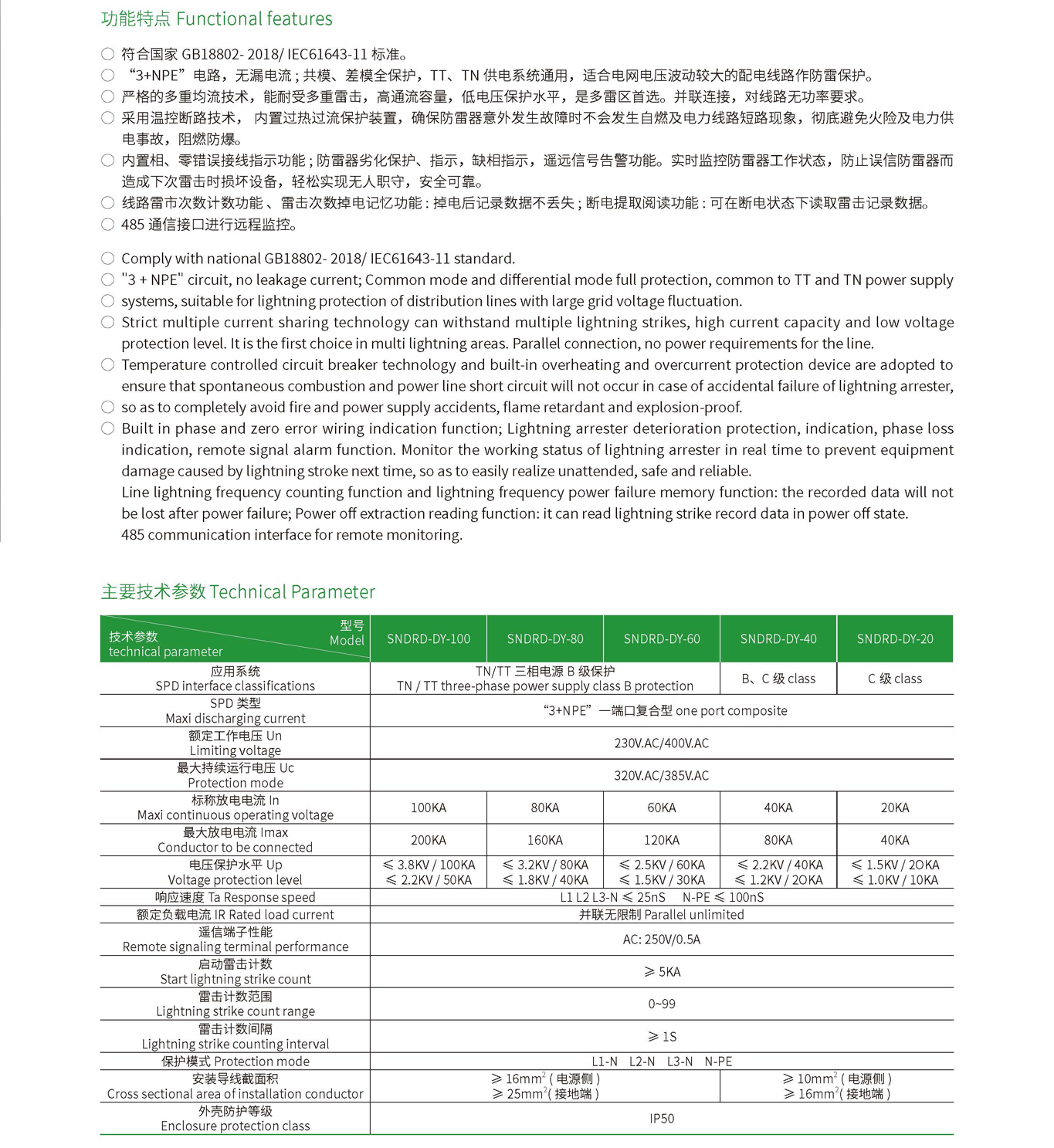SNDRD-DY 三相电源防雷箱系列包含有标称放电电流(8/20uS) 为: 100KA、80KA、60KA、40KA、20KA 共五个等级,适用于各类通