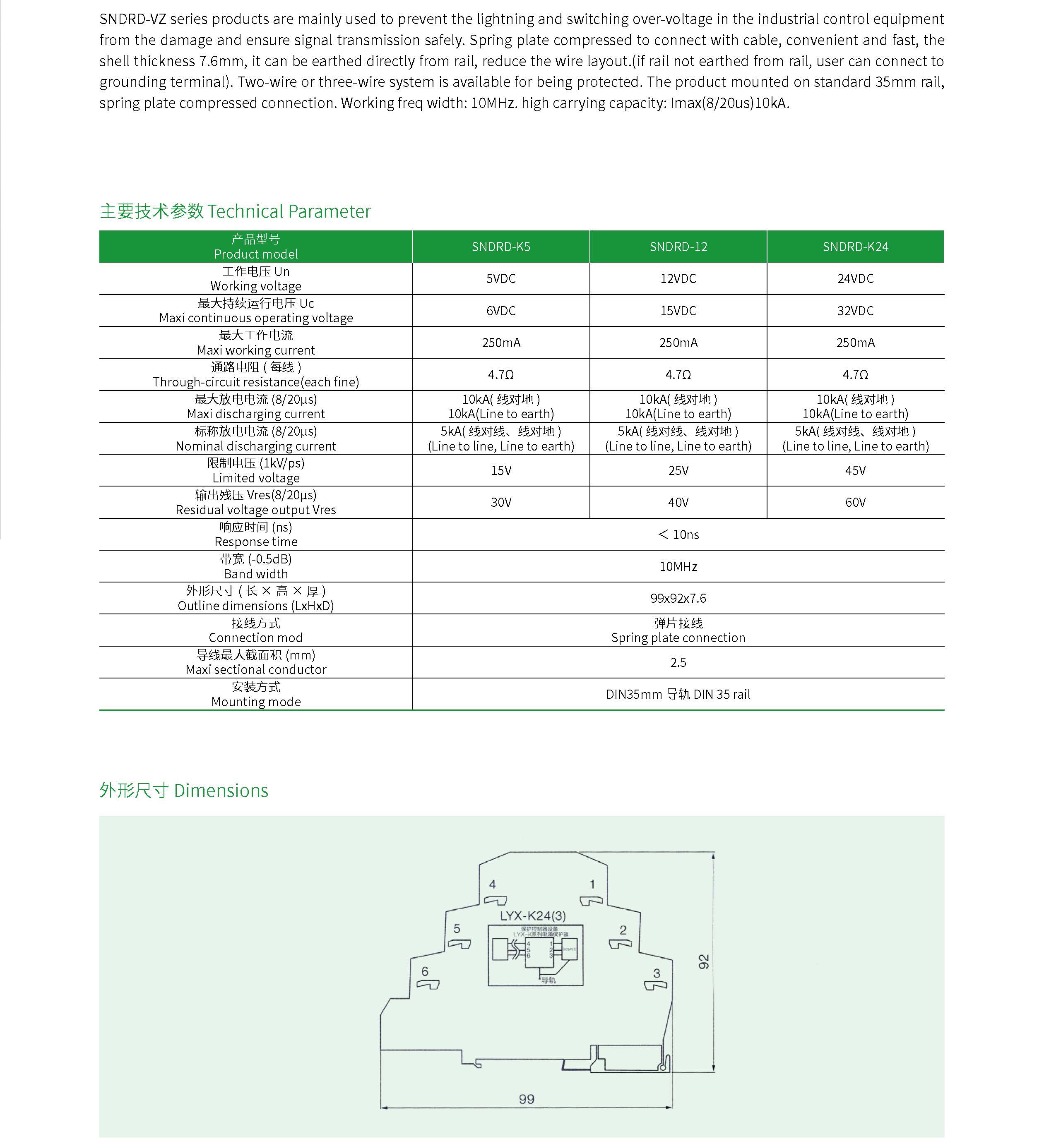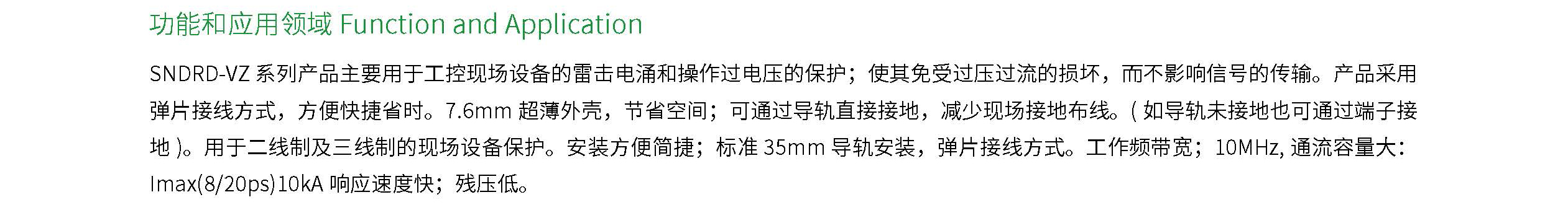 SNDRD-VZ 系列控制信号浪涌保护器主要用于保护以二线制和三线制方式连接的变送器、开关、频率信号、通信设备、热电阻、热电