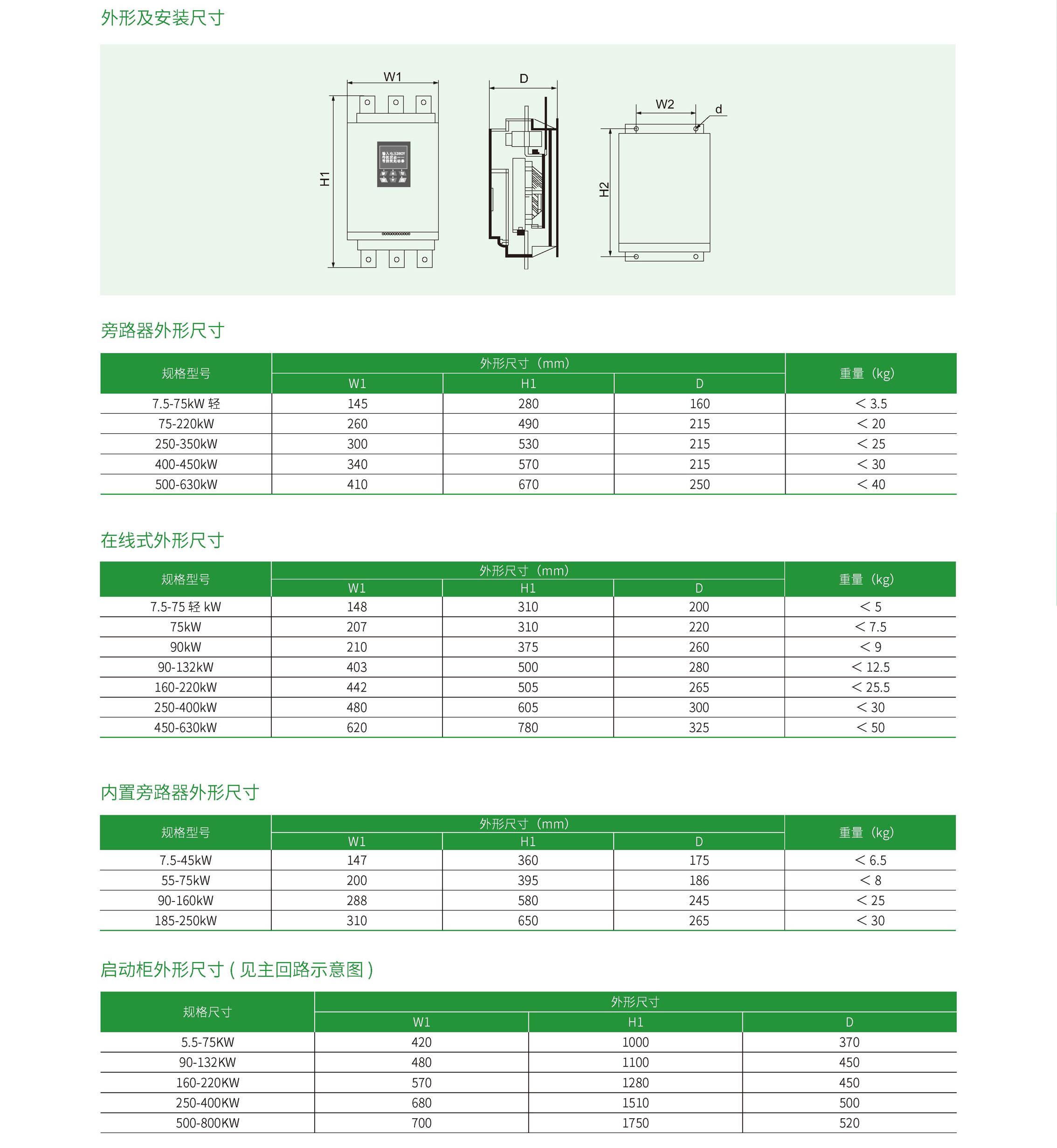 该软起动器瑕盖7.5KW-630KW, 质量可靠, 电磁兼容性(EMC) 好, 可广泛应用千风机、 水泵、 球磨机、 破碎机、 输送类及压缩机