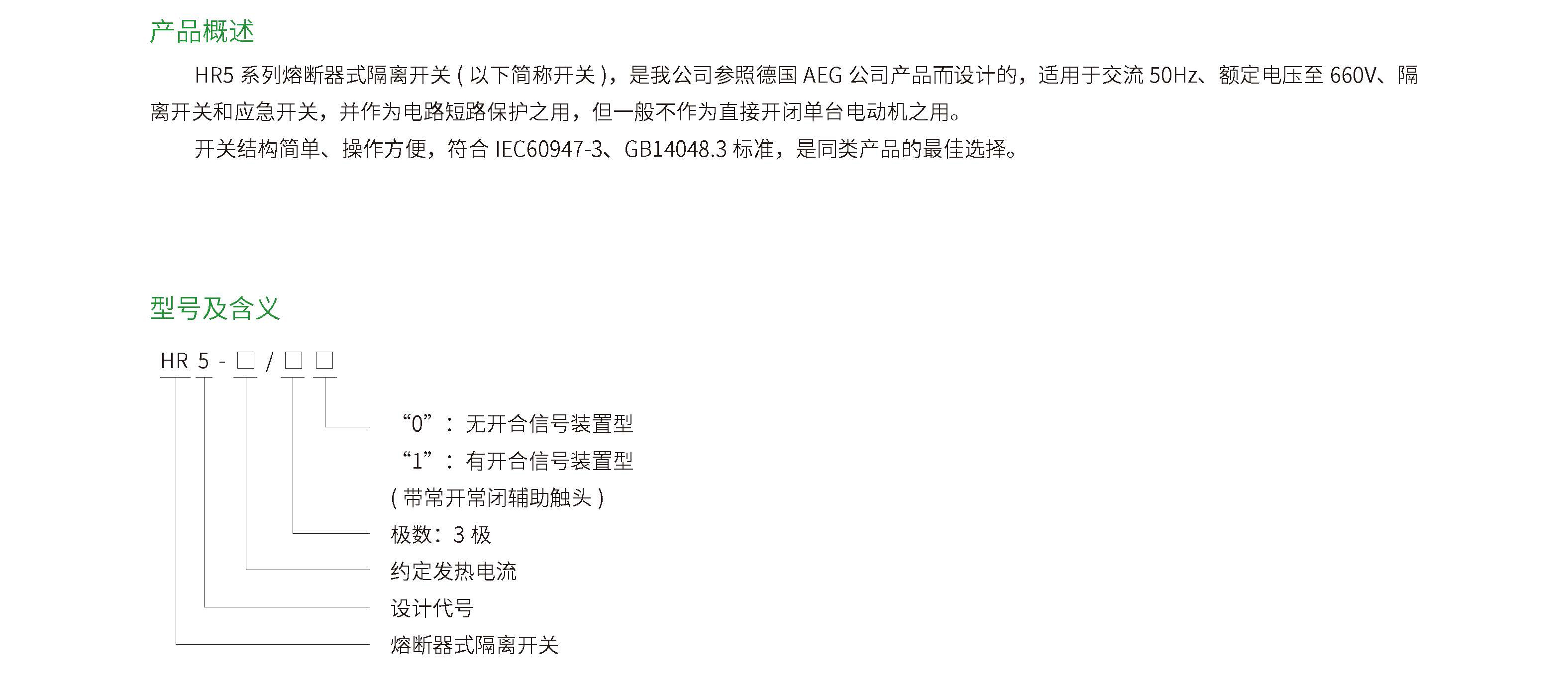 HR5 系列熔断器式隔离开关( 以下简称开关),是我公司参照德国AEG 公司产品而设计的,适用于交流50Hz、额定电压至660V、隔