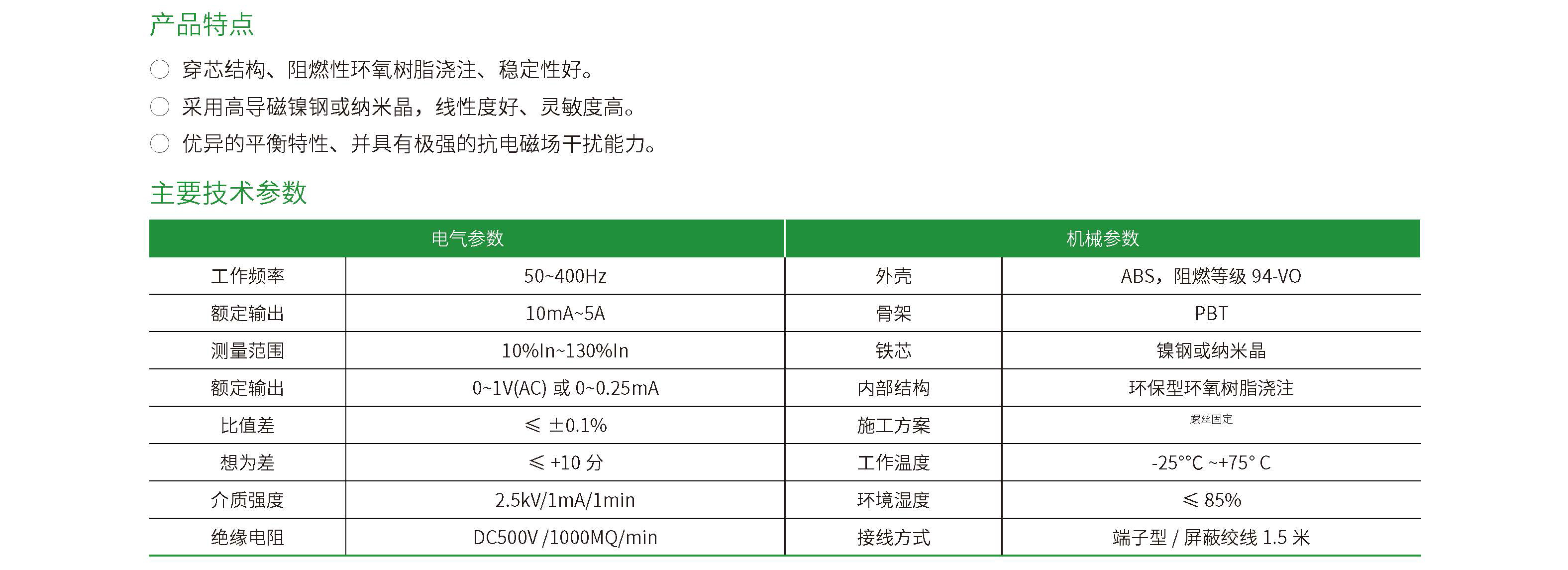 本系列产品测量范围宽,额定一次电流范围:100mA~5A 额定二次电流范围: 0~2mA, 优异先进的制作工艺流程。保证了其准确度等级,可