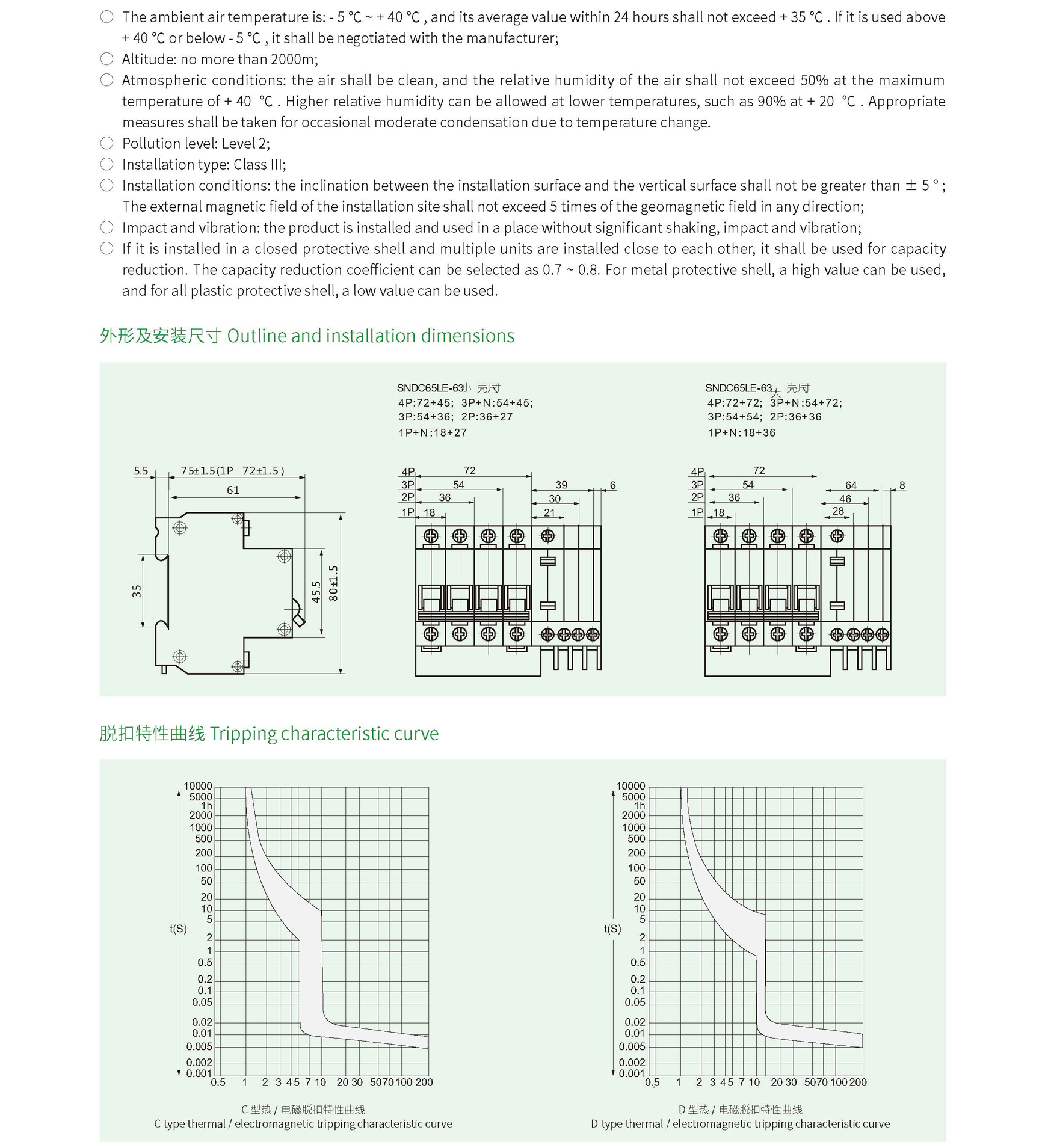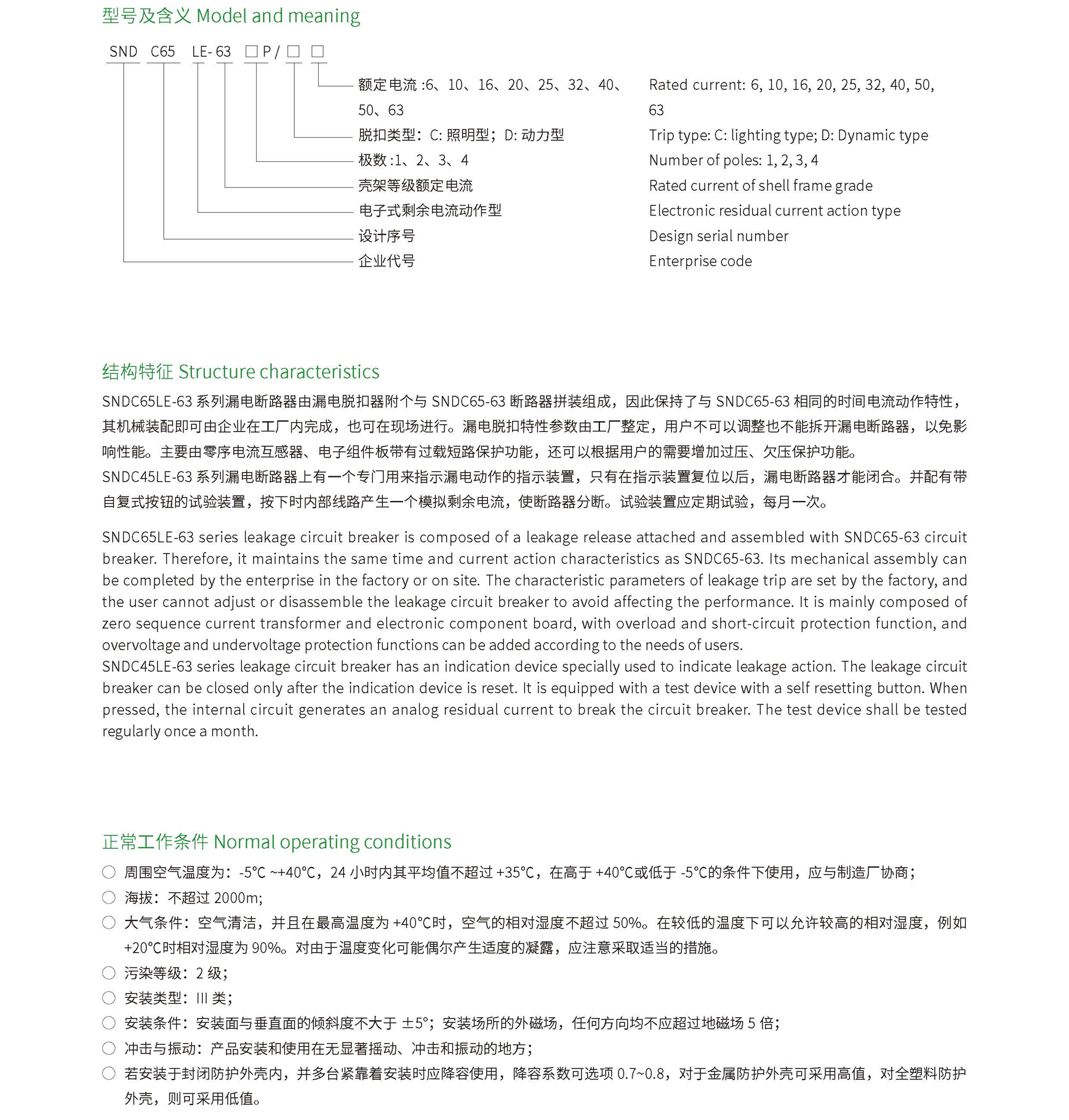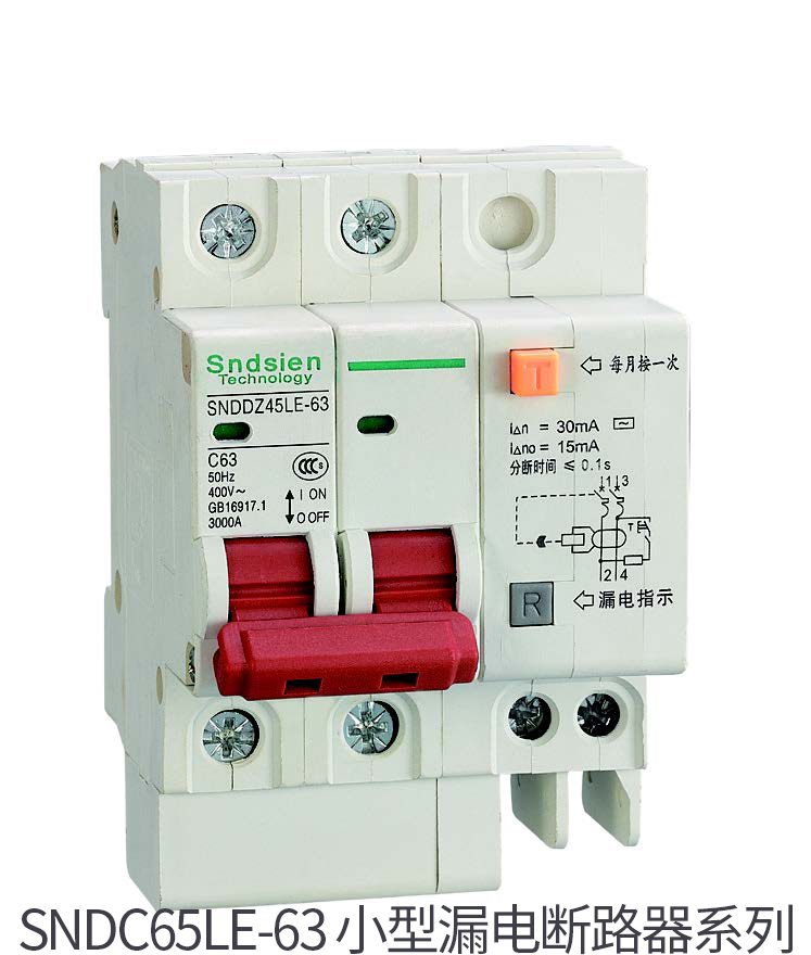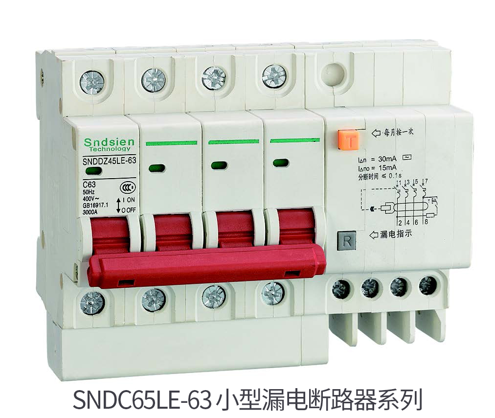 SNDC65LE-63 系列小型断路器适用于交流50Hz 或60Hz,额定工作电压230/400V 及以下,额定电流63A 及以下的线路中,当有人触电